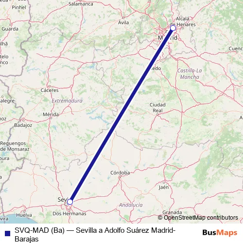 See why over 2 million users trust and consider busmaps.com as the best public transport website. busmaps gives you Sevilla Flights suggested routes, real-time bus tracker, line route maps in Sevilla, and helps to find the closest SVQ-MAD (Ba) air stops near you. No internet available? Download an offline PDF map and bus schedule for the SVQ-MAD (Ba) air to take on your trip.