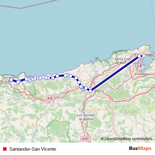 The first stop of the Santander-San Vicente bus route is E.Autobuses Santander (Santander) and the last stop is Terminal Autobuses (San Vicente de la Barquera). Santander-San Vicente (Santander-San Vicente) is operational during cada dia.