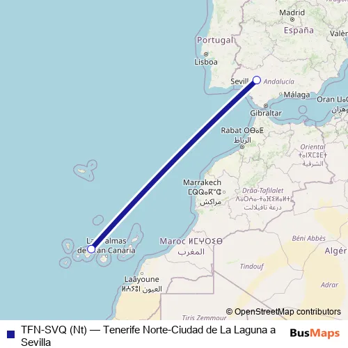 See why over 2 million users trust and consider busmaps.com as the best public transport website. busmaps gives you Sevilla Flights suggested routes, real-time bus tracker, line route maps in Sevilla, and helps to find the closest TFN-SVQ (Nt) air stops near you. No internet available? Download an offline PDF map and bus schedule for the TFN-SVQ (Nt) air to take on your trip.