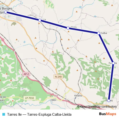 The first stop of the Tarres lle bus route is Tarres and the last stop is Les Borges Blanques. Tarres lle (Tarres-Espluga Calba-Lleida) is operational during dies feiners.