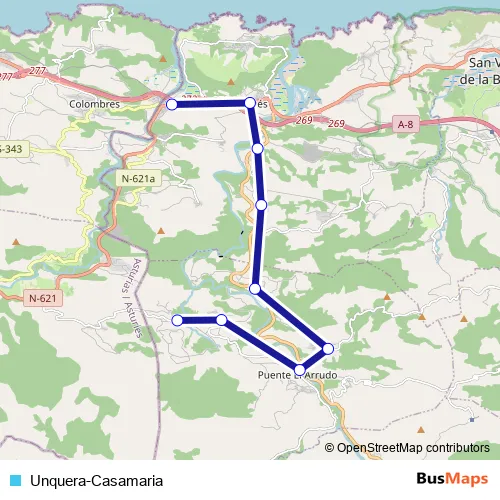 The first stop of the Unquera-Casamaria bus route is Terminal Autobuses (Unquera) and the last stop is Casamaria (Casamaria). Unquera-Casamaria (Unquera-Casamaria) is operational during cada dia.