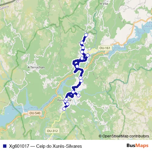 The first stop of the Xg601017 bus route is Lobios (Centro DE Saúde) and the last stop is Silvares. Xg601017 (Ceip do Xurés-Silvares) is operational during dies feiners.