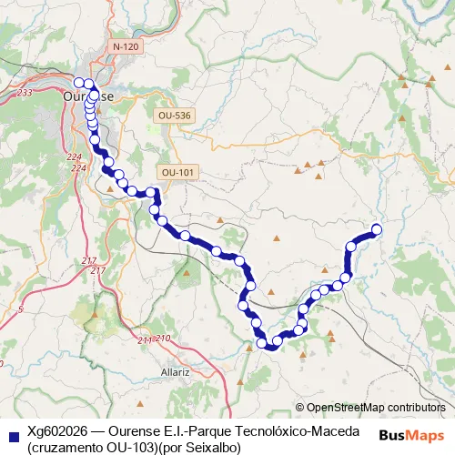 The first stop of the Xg602026 bus route is Maceda (cruzamento OU-103) and the last stop is Ourense E.I.. Xg602026 (Ourense E.I.-Parque Tecnolóxico-Maceda (cruzamento OU-103)(por Seixalbo)) is operational during cada dia.