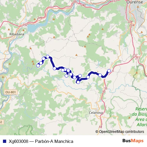 The first stop of the Xg603008 bus route is Parbón and the last stop is A Manchica (marquesiña Ceramica). Xg603008 (Parbón-A Manchica) is operational during cada dia.