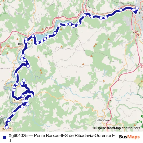 The first stop of the Xg604025 bus route is Ponte Barxas and the last stop is Ourense E.I.. Xg604025 (Ponte Barxas-IES de Ribadavia-Ourense E.I) is operational during dies feiners.
