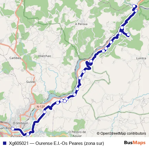 The first stop of the Xg605021 bus route is Peares OS (Zona Norte) and the last stop is Ourense E.I.. Xg605021 (Ourense E.I.-Os Peares (zona sur)) is operational during dies feiners.
