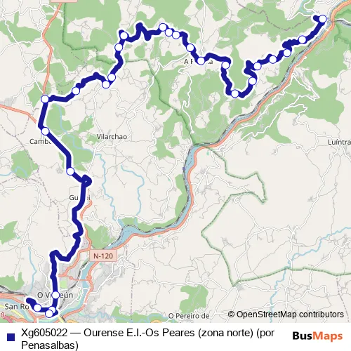 The first stop of the Xg605022 bus route is Ourense E.I. and the last stop is Peares OS (Zona Norte). Xg605022 (Ourense E.I.-Os Peares (zona norte) (por Penasalbas)) is operational during dies feiners.