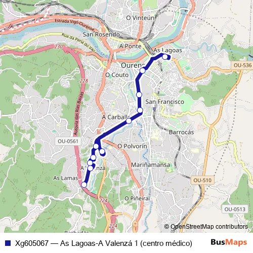 The first stop of the Xg605067 bus route is AS Lagoas and the last stop is A Valenzá 1-Avda. Celanova nº2. Xg605067 (As Lagoas-A Valenzá 1 (centro médico)) is operational during dies feiners.