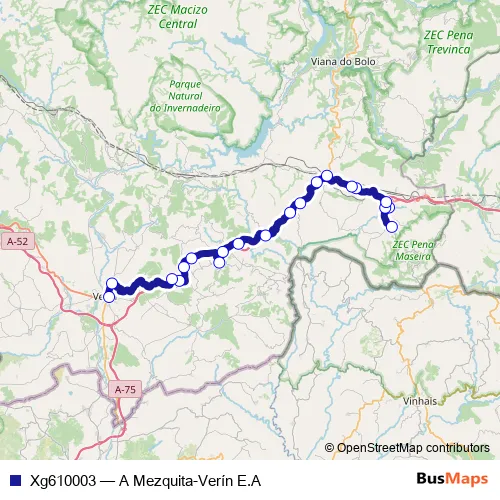 The first stop of the Xg610003 bus route is A Mezquita and the last stop is Verín E.A.. Xg610003 (A Mezquita-Verín E.A) is operational during dies feiners.