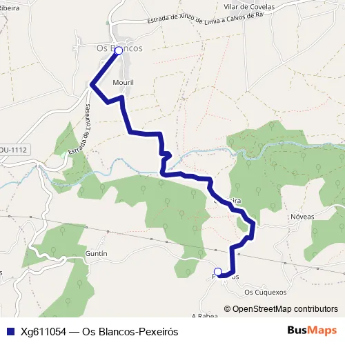 The first stop of the Xg611054 bus route is Pexeirós and the last stop is Os Blancos. Xg611054 (Os Blancos-Pexeirós) is operational during dies feiners.