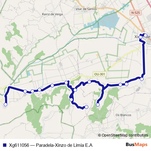 The first stop of the Xg611056 bus route is Paradela and the last stop is Xinzo De Limia E.A.. Xg611056 (Paradela-Xinzo de Limia E.A) is operational during cada dia.