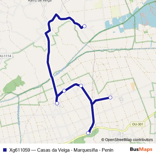 The first stop of the Xg611059 bus route is Penin and the last stop is Casas da Veiga - marquesiña. Xg611059 (Casas da Veiga - Marquesiña - Penin) is operational during dies feiners.