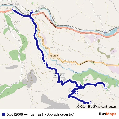The first stop of the Xg612008 bus route is Pusmazán and the last stop is Sobradelo (centro). Xg612008 (Pusmazán-Sobradelo(centro)) is operational during dies feiners.