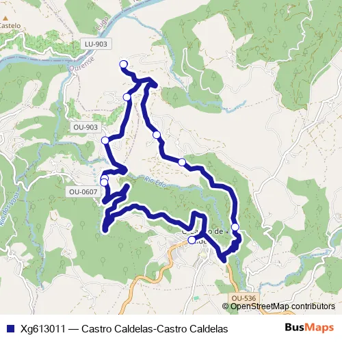 The first stop of the Xg613011 bus route is Castro Caldelas and the last stop is Castro Caldelas. Xg613011 (Castro Caldelas-Castro Caldelas) is operational during cada dia.