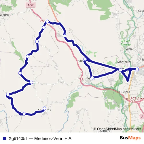 The first stop of the Xg614051 bus route is Verín E.A. and the last stop is Medeiros. Xg614051 (Medeiros-Verín E.A) is operational during cada dia.