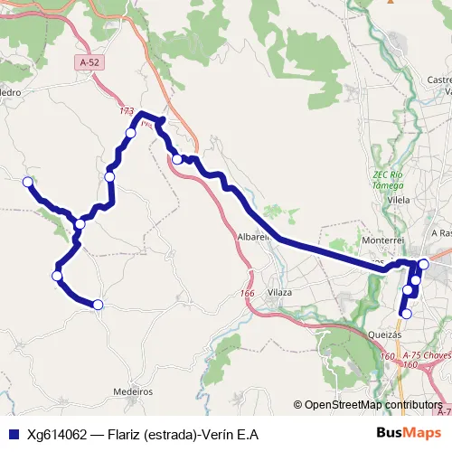 The first stop of the Xg614062 bus route is Verín E.A. and the last stop is Flariz (estrada). Xg614062 (Flariz (estrada)-Verín E.A) is operational during cada dia.