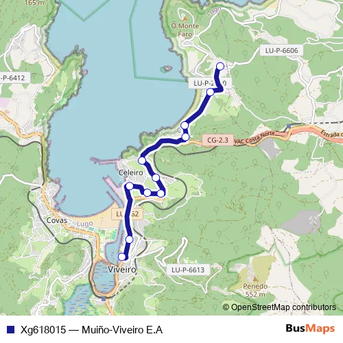 The first stop of the Xg618015 bus route is Viveiro E.A. and the last stop is Muiño. Xg618015 (Muiño-Viveiro E.A) is operational during cada dia.