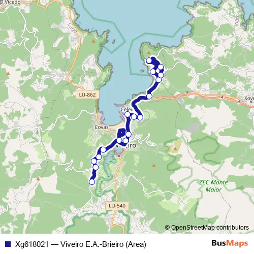The first stop of the Xg618021 bus route is Viveiro E.A. and the last stop is Brieiro (Area). Xg618021 (Viveiro E.A.-Brieiro (Area)) is operational during dies feiners.