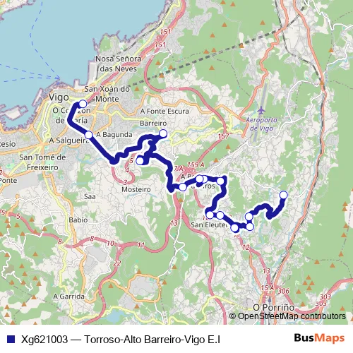 The first stop of the Xg621003 bus route is Torroso-Alto Barreiro and the last stop is Vigo E.I.. Xg621003 (Torroso-Alto Barreiro-Vigo E.I) is operational during dies feiners.