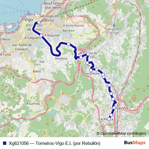 The first stop of the Xg621056 bus route is Torneiros and the last stop is Vigo E.I.. Xg621056 (Torneiros-Vigo E.I. (por Rebullón)) is operational during dies feiners.