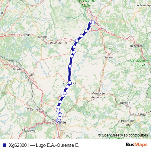 The first stop of the Xg623001 bus route is Ourense E.I. and the last stop is Lugo E.A.. Xg623001 (Lugo E.A.-Ourense E.I) is operational during cada dia.