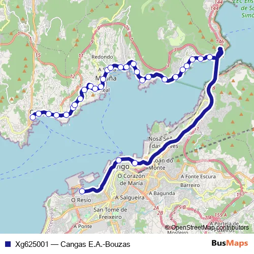 The first stop of the Xg625001 bus route is Cangas E.A. and the last stop is Bouzas. Xg625001 (Cangas E.A.-Bouzas) is operational during cada dia.