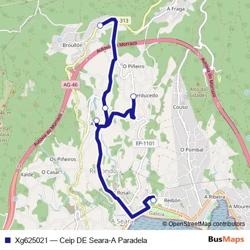 The first stop of the Xg625021 bus route is A Paradela and the last stop is Ceip de Seara. Xg625021 (Ceip DE Seara-A Paradela) is operational during dies feiners.