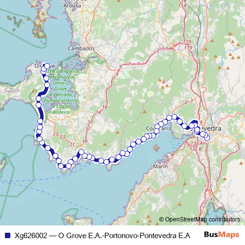The first stop of the Xg626002 bus route is Pontevedra E.A. and the last stop is O Grove E.A.. Xg626002 (O Grove E.A.-Portonovo-Pontevedra E.A) is operational during cada dia.