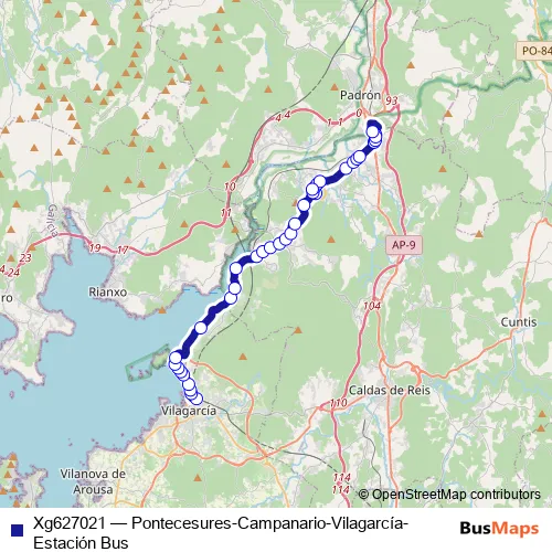 The first stop of the Xg627021 bus route is Vilagarcía-Estación Bus and the last stop is Pontecesures (estación tren). Xg627021 (Pontecesures-Campanario-Vilagarcía-Estación Bus) is operational during cada dia.