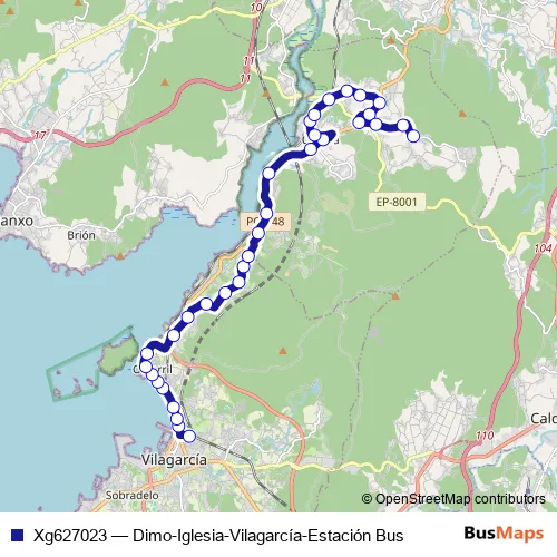 The first stop of the Xg627023 bus route is Vilagarcía-Estación Bus and the last stop is Dimo-Iglesia. Xg627023 (Dimo-Iglesia-Vilagarcía-Estación Bus) is operational during cada dia.