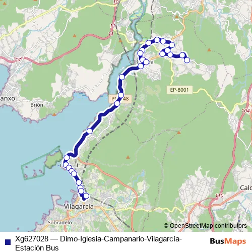 The first stop of the Xg627028 bus route is Dimo-Iglesia and the last stop is Vilagarcía-Estación Bus. Xg627028 (Dimo-Iglesia-Campanario-Vilagarcía-Estación Bus) is operational during dies feiners.
