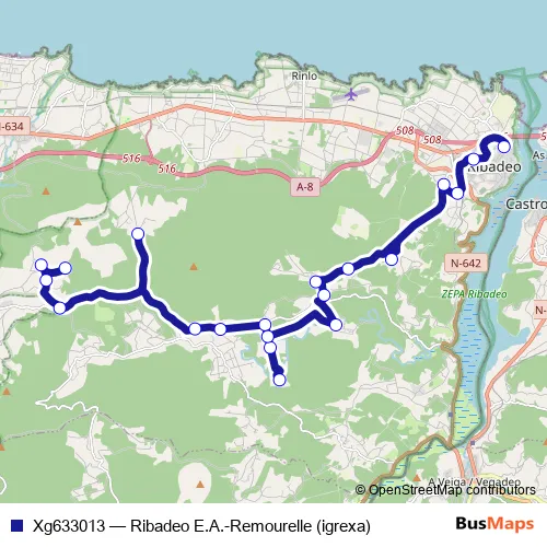 The first stop of the Xg633013 bus route is Remourelle (igrexa) and the last stop is Ribadeo E.A.. Xg633013 (Ribadeo E.A.-Remourelle (igrexa)) is operational during dies feiners.