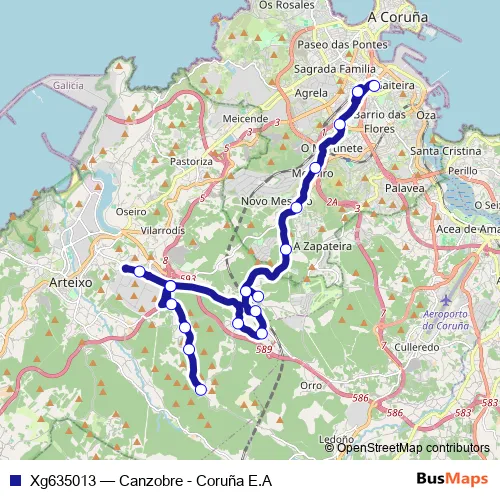 The first stop of the Xg635013 bus route is Canzobre and the last stop is Coruña E.A.. Xg635013 (Canzobre - Coruña E.A) is operational during dies feiners.