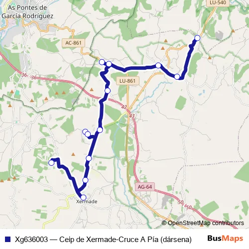 The first stop of the Xg636003 bus route is Cruce A PÍA (Dársena) and the last stop is Ceip DE Xermade. Xg636003 (Ceip de Xermade-Cruce A Pía (dársena)) is operational during dies feiners.