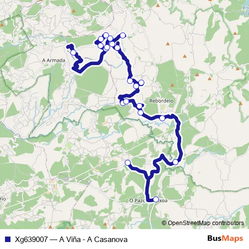 The first stop of the Xg639007 bus route is A Casanova and the last stop is A Viña. Xg639007 (A Viña - A Casanova) is operational during dies feiners.
