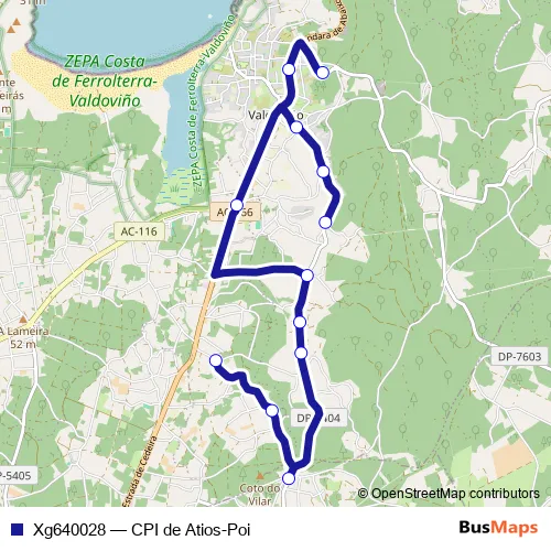 The first stop of the Xg640028 bus route is Poi and the last stop is CPI DE Atios. Xg640028 (CPI de Atios-Poi) is operational during dies feiners.