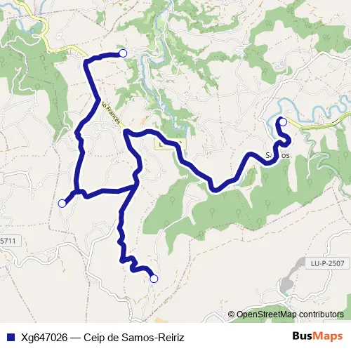 The first stop of the Xg647026 bus route is Reiriz and the last stop is Ceip de Samos. Xg647026 (Ceip de Samos-Reiriz) is operational during dies feiners.