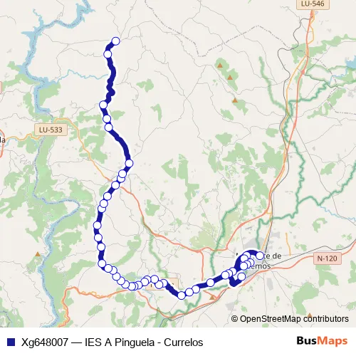 The first stop of the Xg648007 bus route is IES A Pinguela and the last stop is Currelos. Xg648007 (IES A Pinguela - Currelos) is operational during dies feiners.