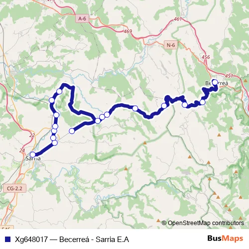 The first stop of the Xg648017 bus route is Sarria E.A. and the last stop is Becerreá. Xg648017 (Becerreá - Sarria E.A) is operational during dies feiners.