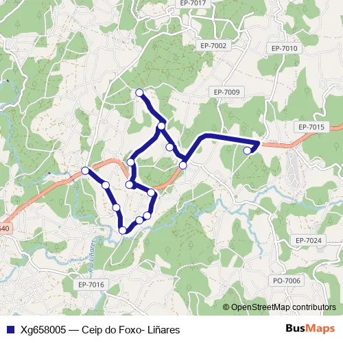 The first stop of the Xg658005 bus route is Ceip do Foxo and the last stop is Liñares. Xg658005 (Ceip do Foxo- Liñares) is operational during dies feiners.