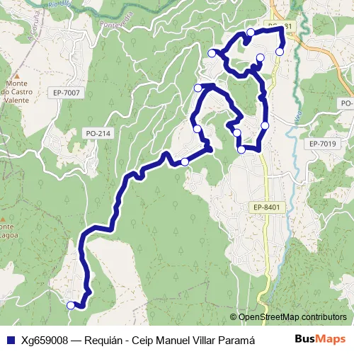 The first stop of the Xg659008 bus route is Ceip Manuel Villar Paramá and the last stop is Requián. Xg659008 (Requián - Ceip Manuel Villar Paramá) is operational during dies feiners.