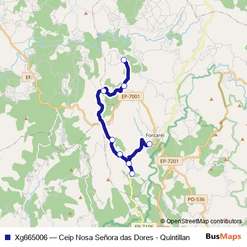 The first stop of the Xg665006 bus route is Ceip Nosa Señora das Dores and the last stop is Quintillán. Xg665006 (Ceip Nosa Señora das Dores - Quintillan) is operational during dies feiners.