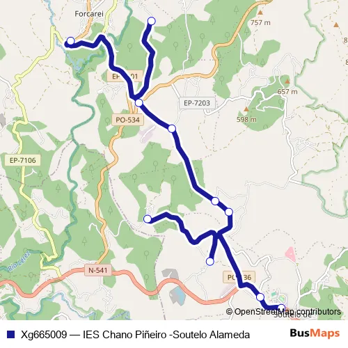 The first stop of the Xg665009 bus route is IES Chano Piñeiro and the last stop is Soutelo Alameda. Xg665009 (IES Chano Piñeiro -Soutelo Alameda) is operational during dies feiners.