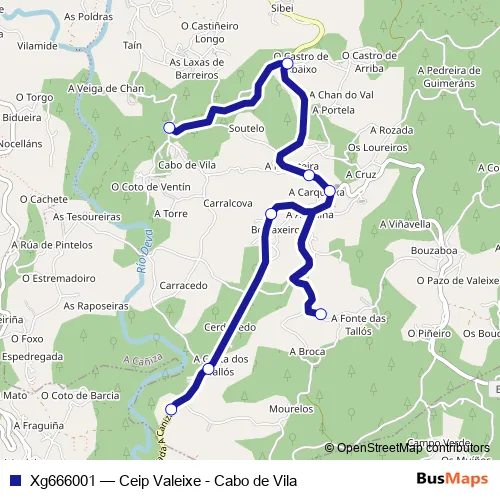 The first stop of the Xg666001 bus route is Cabo de Vila and the last stop is Ceip de Valeixe. Xg666001 (Ceip Valeixe - Cabo de Vila) is operational during dies feiners.