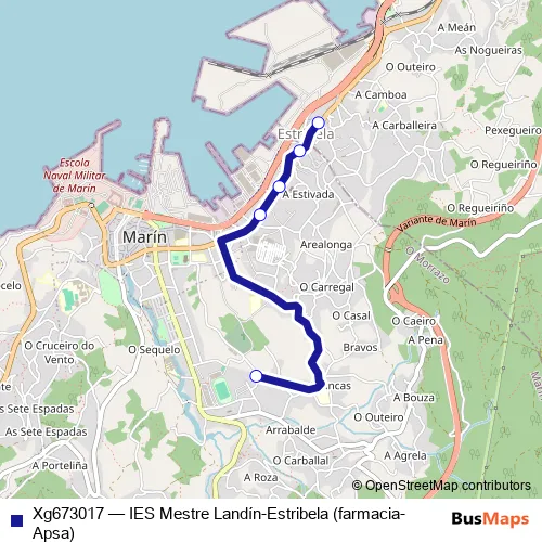 The first stop of the Xg673017 bus route is IES Mestre Landín and the last stop is Estribela (farmacia-Apsa). Xg673017 (IES Mestre Landín-Estribela (farmacia-Apsa)) is operational during dies feiners.