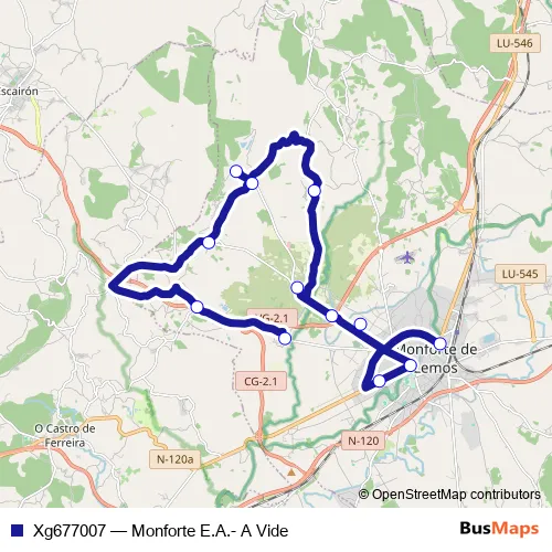 The first stop of the Xg677007 bus route is Monforte E.A. and the last stop is A Vide. Xg677007 (Monforte E.A.- A Vide) is operational during dies feiners.