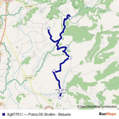 The first stop of the Xg677011 bus route is Pobra De Brollón and the last stop is Biduedo. Xg677011 (Pobra DE Brollón - Biduedo) is operational during dies feiners.