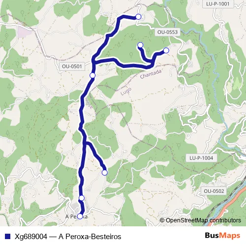 The first stop of the Xg689004 bus route is A Peroxa and the last stop is Besteiros. Xg689004 (A Peroxa-Besteiros) is operational during dies feiners.