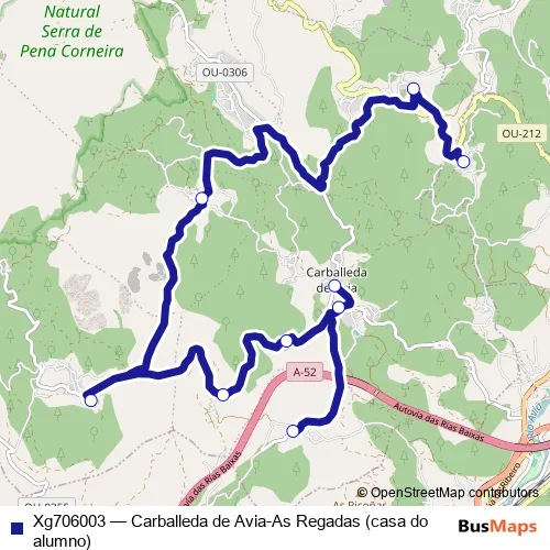 The first stop of the Xg706003 bus route is Carballeda DE Avia and the last stop is As Regadas (casa do alumno). Xg706003 (Carballeda de Avia-As Regadas (casa do alumno)) is operational during dies feiners.