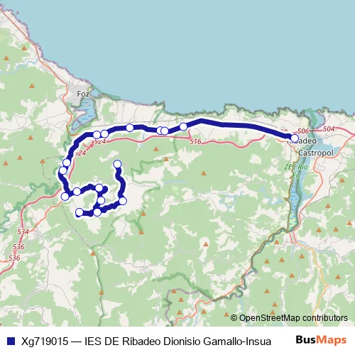 The first stop of the Xg719015 bus route is Insua and the last stop is IES de Ribadeo Dionisio Gamallo. Xg719015 (IES DE Ribadeo Dionisio Gamallo-Insua) is operational during dies feiners.